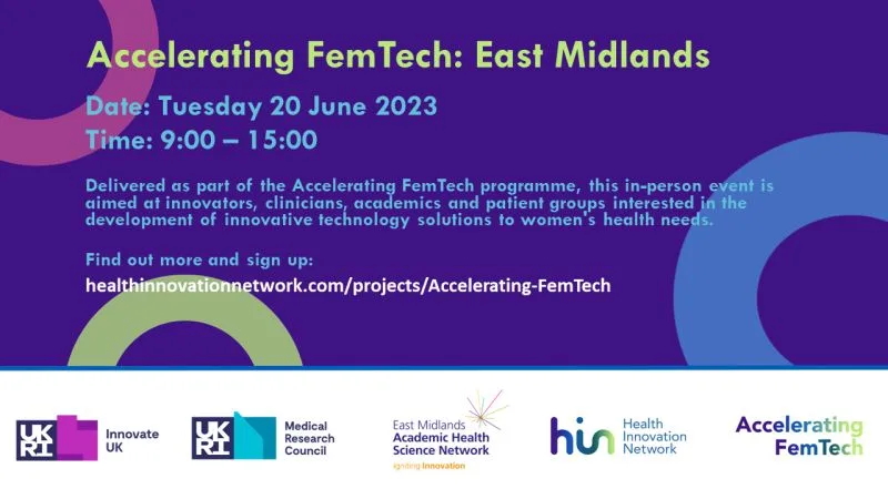 East Midlands Academic Health Science Network is pleased to launch their Accelerating FemTech: East Midlands event, which will be taking place at Charnwood Campus in Loughborough on Tuesday 20 June.